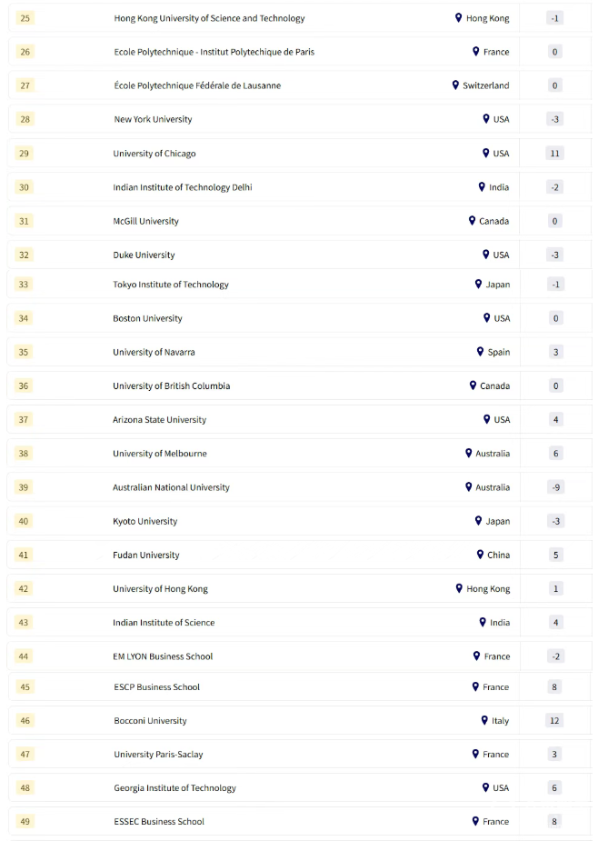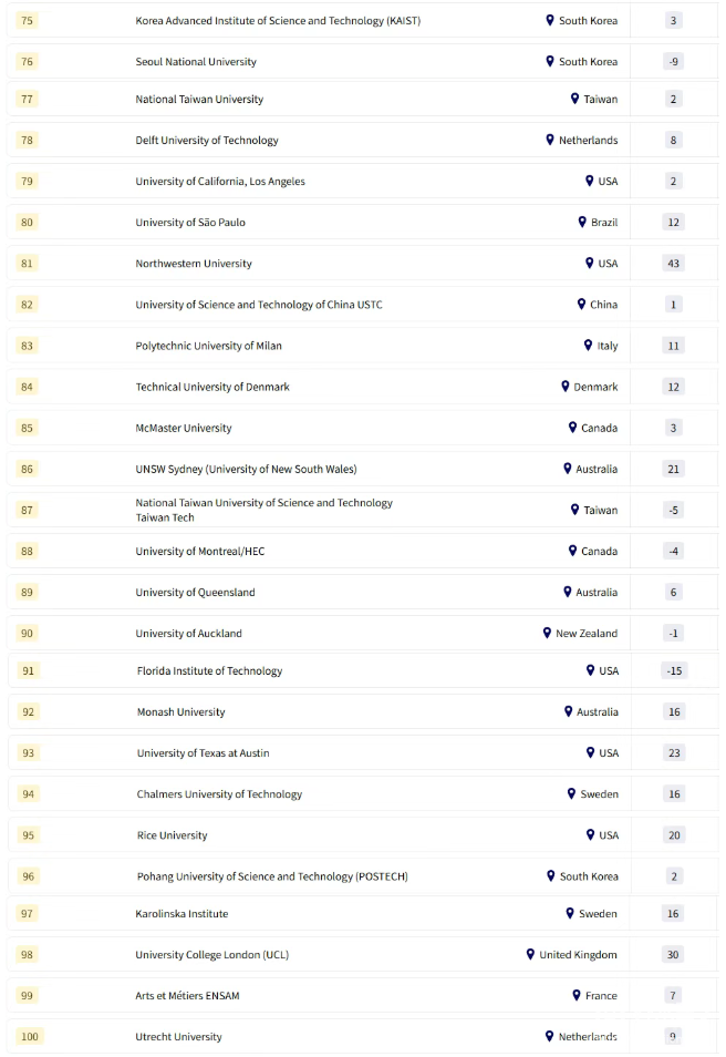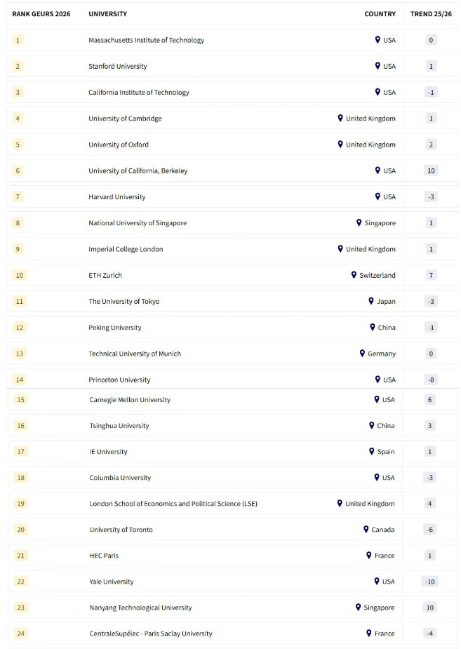 中國:北京大學(xué)(第12)和清華大學(xué)(第16)位列前20,香港科技大學(xué)(第25)和復(fù)旦大學(xué)(第41)也表現(xiàn)優(yōu)異。